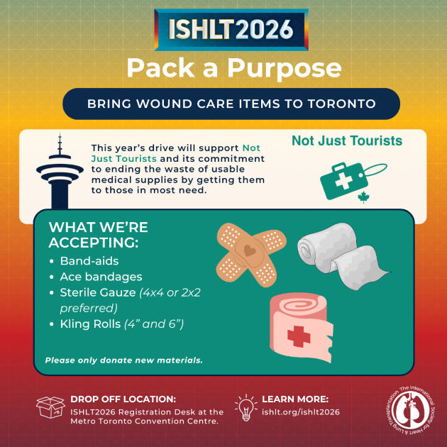 Donate band-aids, ace bandages, sterile gauze, or kling rolls to the ISHLT2026 Wound Care Drive to support Not Just Tourists. Donations will be accepted by the Registration Desk on the 600 Level.
