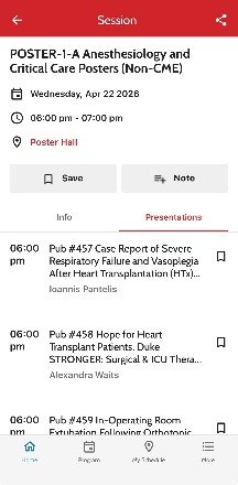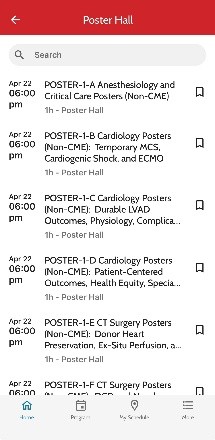 View the poster hall times and topics throughout the week in the mobile app by tapping “Poster Hall” on the app dashboard. Tap into a topic and then select “Presentations” to see a detailed list of every presenter and poster in that category. Tap on the poster title to read the description and to save the poster to your schedule.