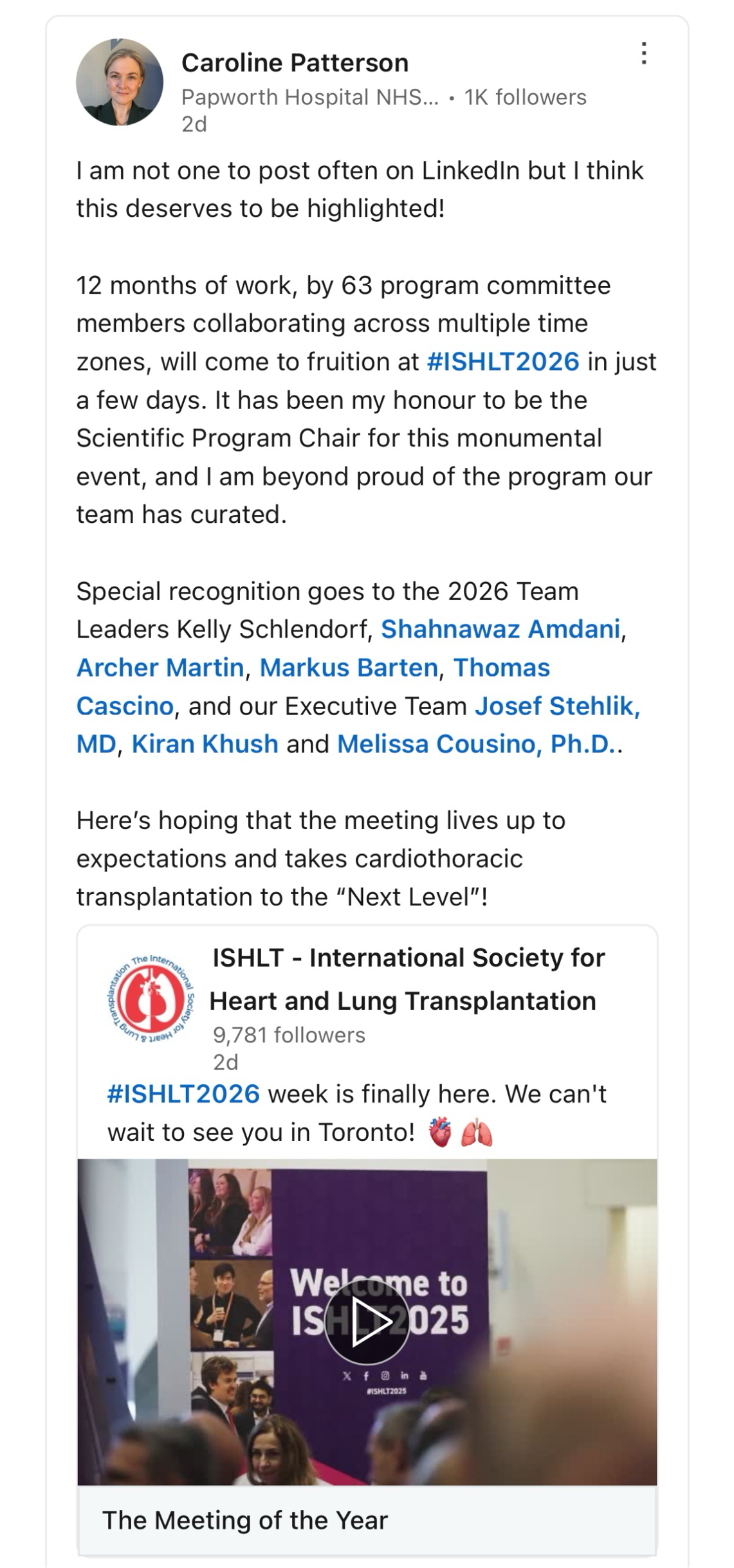 Are you following along on social media? There’s a great conversation going. Visit the #ISHLT2026 hashtag to tap into the discussion and be sure to use the hashtag when you post anywhere about the ISHLT Annual Meeting.