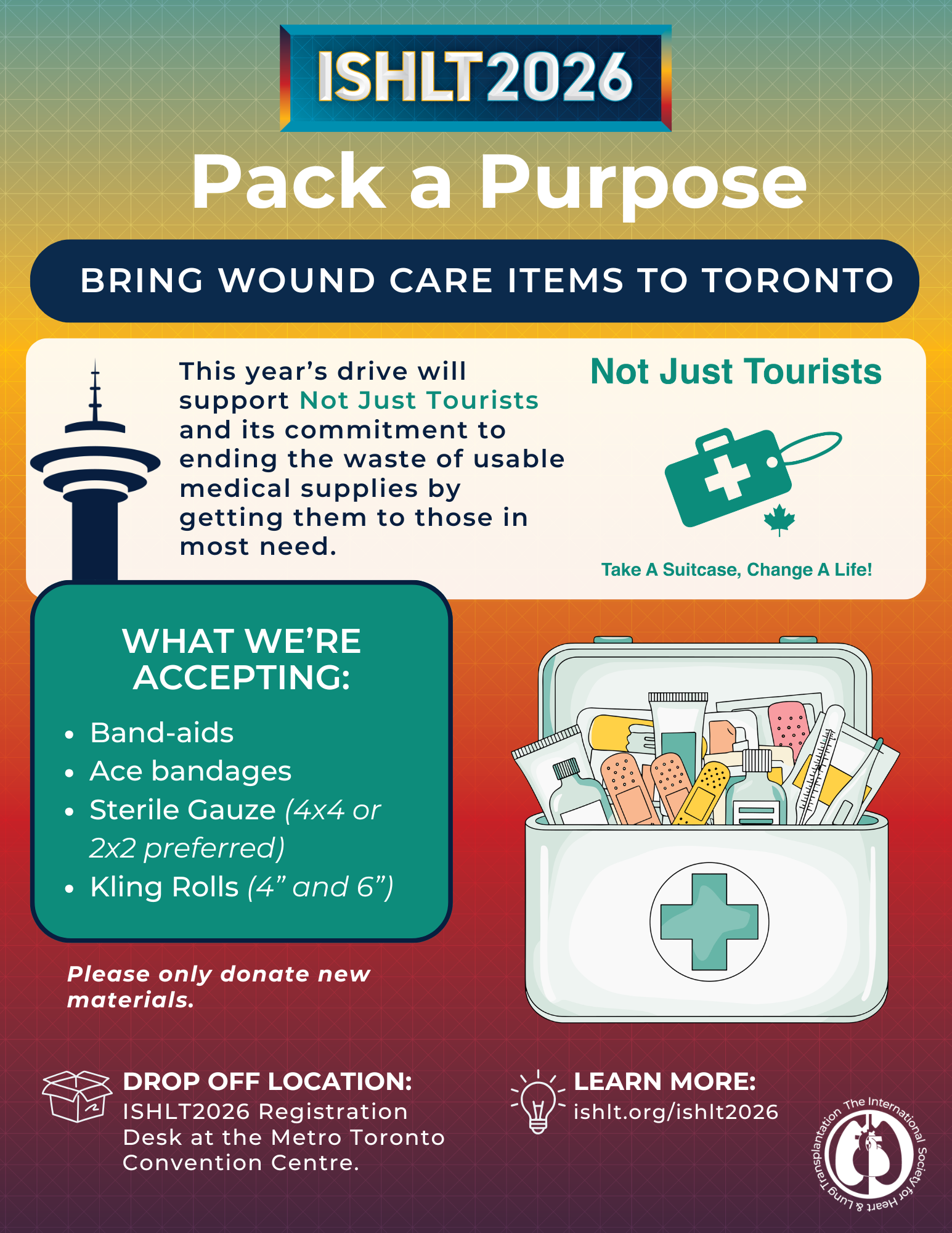 As part of ISHLT’s social responsibility efforts, the Society is collecting donations of wound care items at ISHLT2026 to support Not Just Tourists.